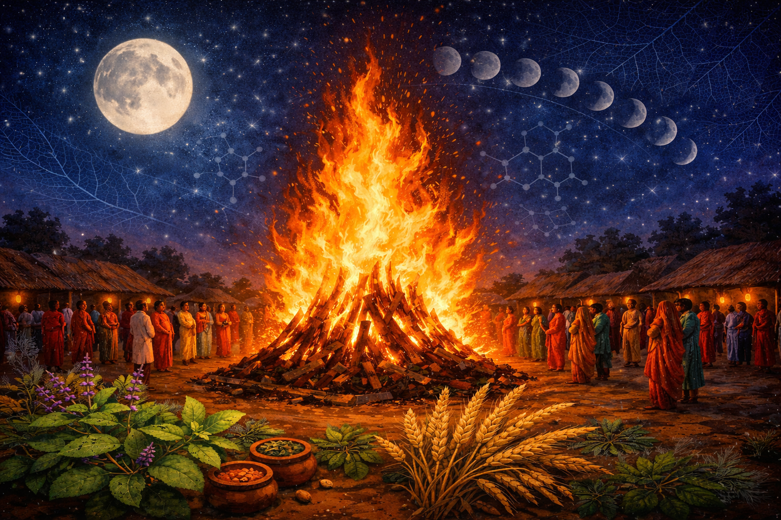 • ઘઉંના ડૂંડા — નવા પાકનું પ્રતીક. તેના દહનથી પોટેશિયમ સમૃદ્ધ રાખ (ash) બને છે, જે જમીન માટે ઉત્તમ ખાતર છે.